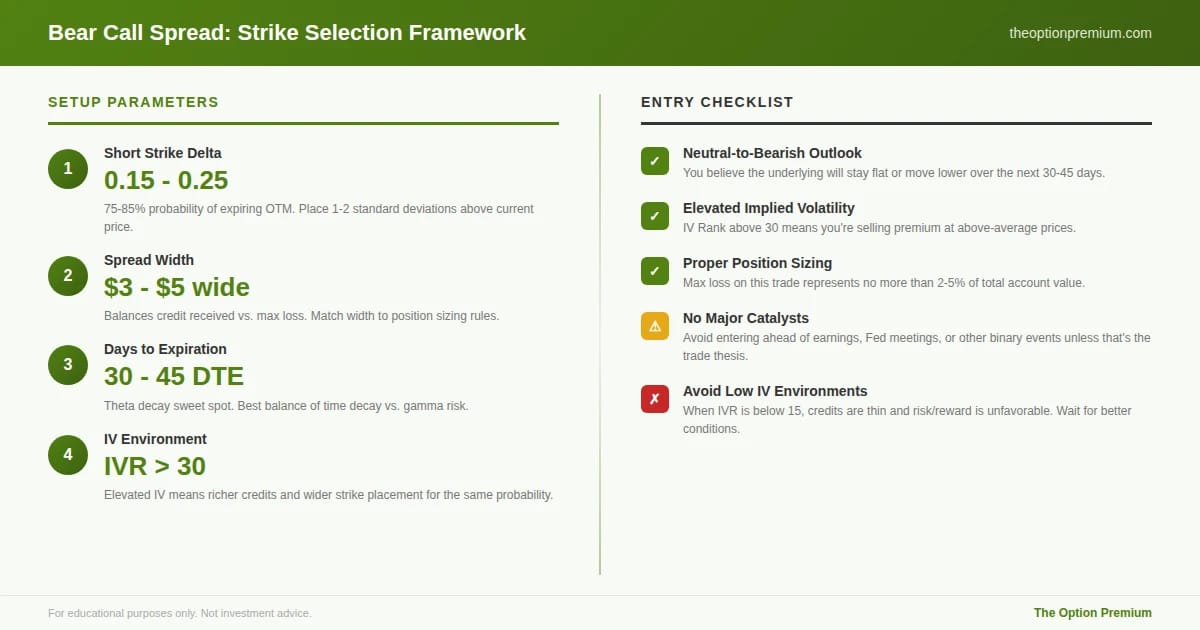 Bear call spread strike selection framework with setup parameters and entry checklist for options traders