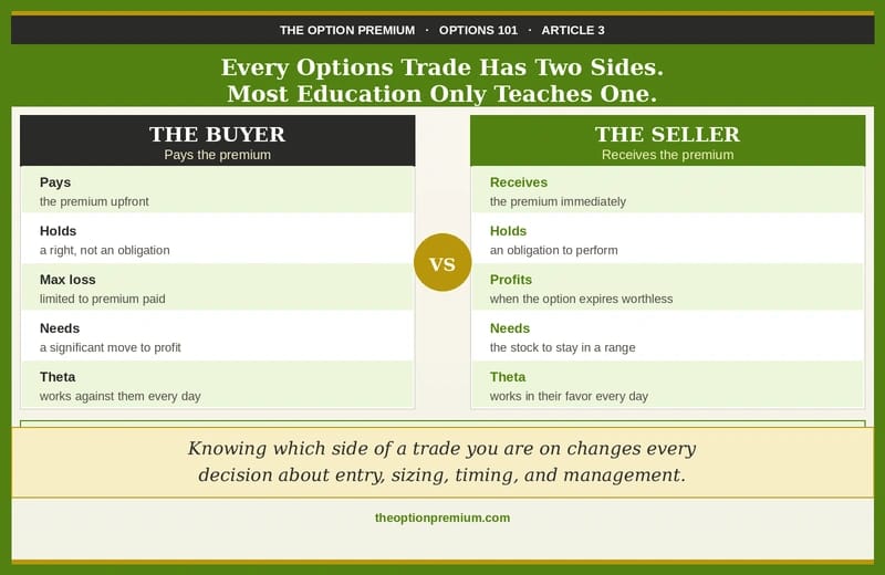Every options trade has two sides: a buyer and a seller. Most beginner education covers only the buyer. Understanding what the seller does, why they do it, and what they receive in return is the insight that opens the second half of options education.