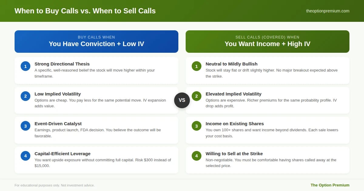 Buy calls when you have strong directional conviction, IV is low, a specific catalyst exists, or you want capital-efficient leverage. Sell covered calls when you're neutral to mildly bullish, IV is elevated, you want income on existing shares, and you'd be comfortable having shares called away at the strike.