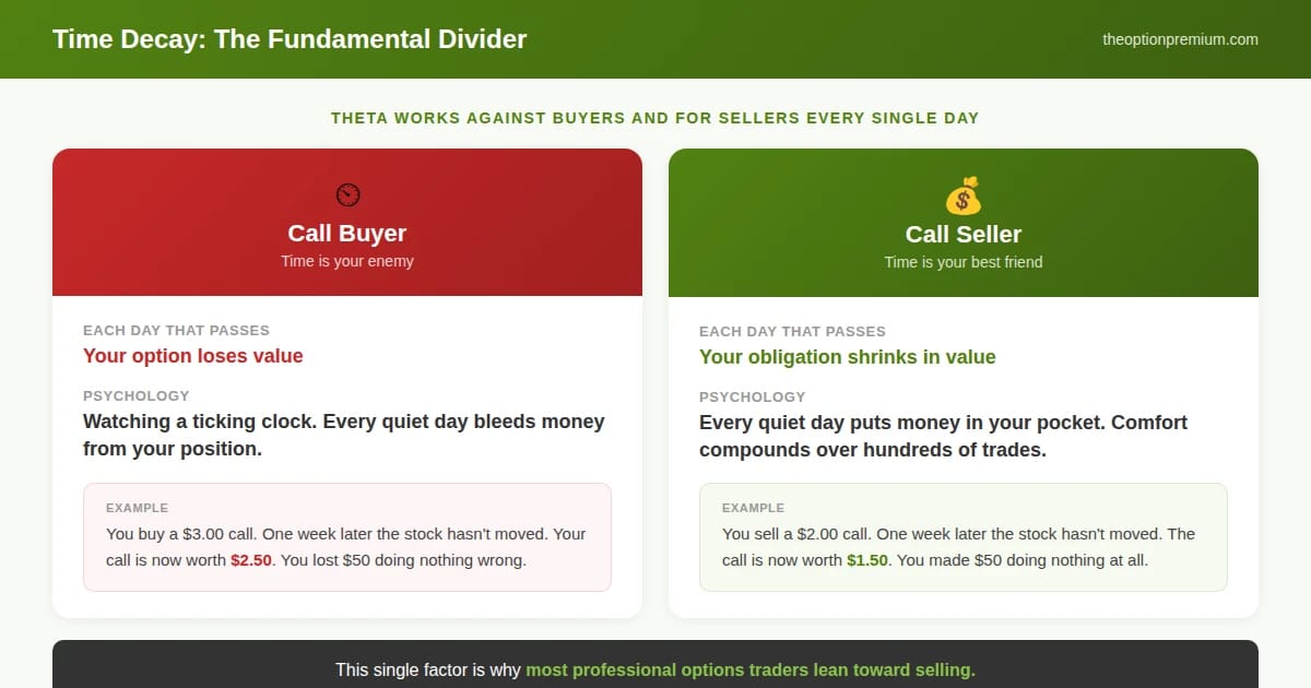 The fundamental divider between buying and selling calls. A quiet week costs the buyer $50 as theta erodes the option's value. The same quiet week earns the seller $50 as their obligation shrinks. Over hundreds of trades, this compounding comfort vs. compounding stress affects decision-making and shows up in results.