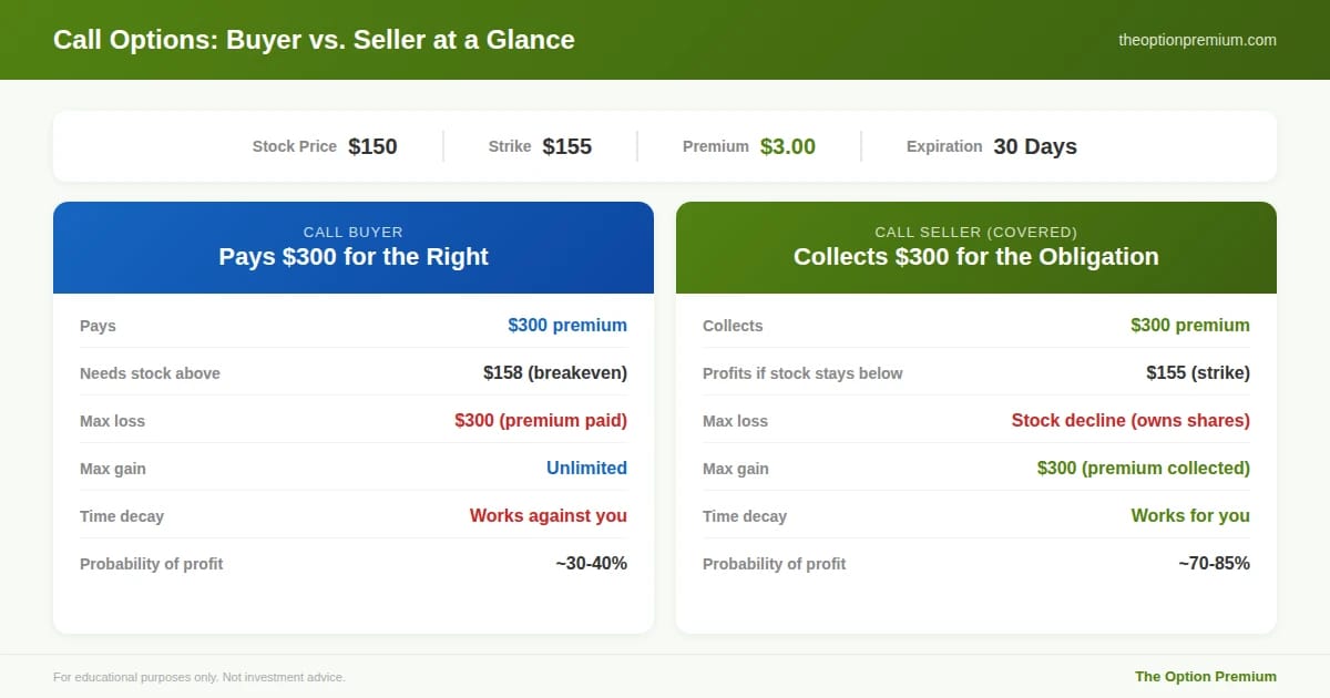 Who pays and who collects. The buyer pays premium. The seller collects it. This single difference drives everything else. The buyer needs the stock to move enough to overcome their cost. The seller profits when it doesn't.