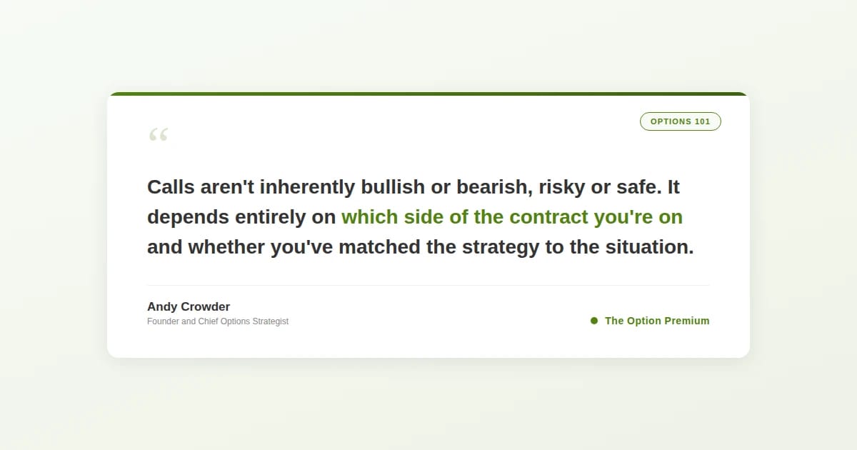 Calls aren't inherently bullish or bearish, risky or safe. It depends entirely on which side of the contract you're on and whether you've matched the strategy to the situation.