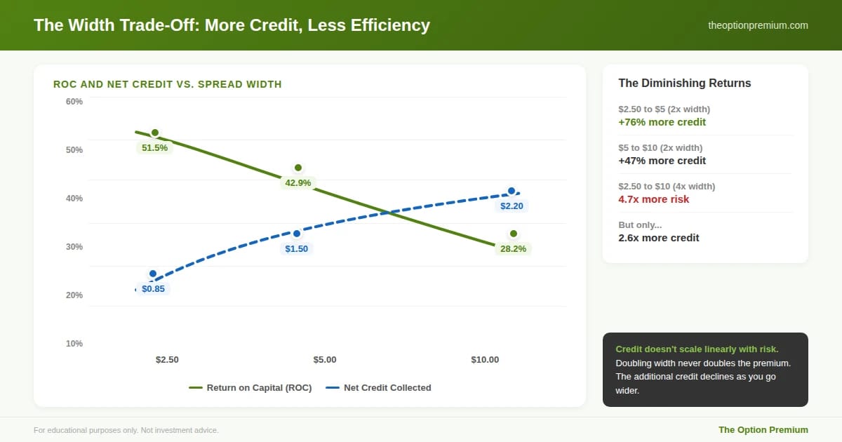 The width trade-off visualized. As width increases, net credit rises (blue dashed line) but ROC declines (green solid line). Credit doesn't scale linearly with risk: going from $2.50 to $5 adds 76% more credit, but $5 to $10 adds only 47% more. Meanwhile, going from $2.50 to $10 wide means 4.7x more risk for just 2.6x more credit.