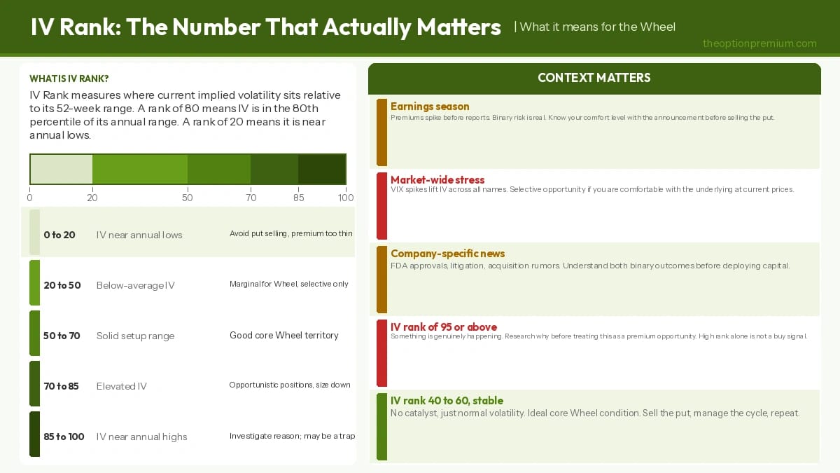 Wheel strategy IV rank guide: color-coded gauge from 0 to 100 with five zone interpretations and five context situations that affect reading.