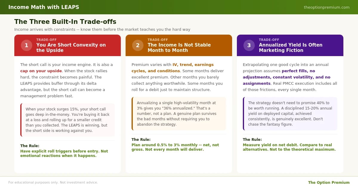 A PMCC can generate income, sometimes substantial income. But that income isn't free. It arrives with three built-in trade-offs.