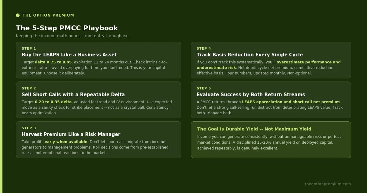 Step 5: Evaluate success correctly. A PMCC generates returns through two streams: LEAPS appreciation or depreciation, and short call net premium. Effective management means you're not blind to either component. Don't let a string of successful short calls distract you from deteriorating LEAPS value, and don't let LEAPS gains tempt you into sloppy short call selection.