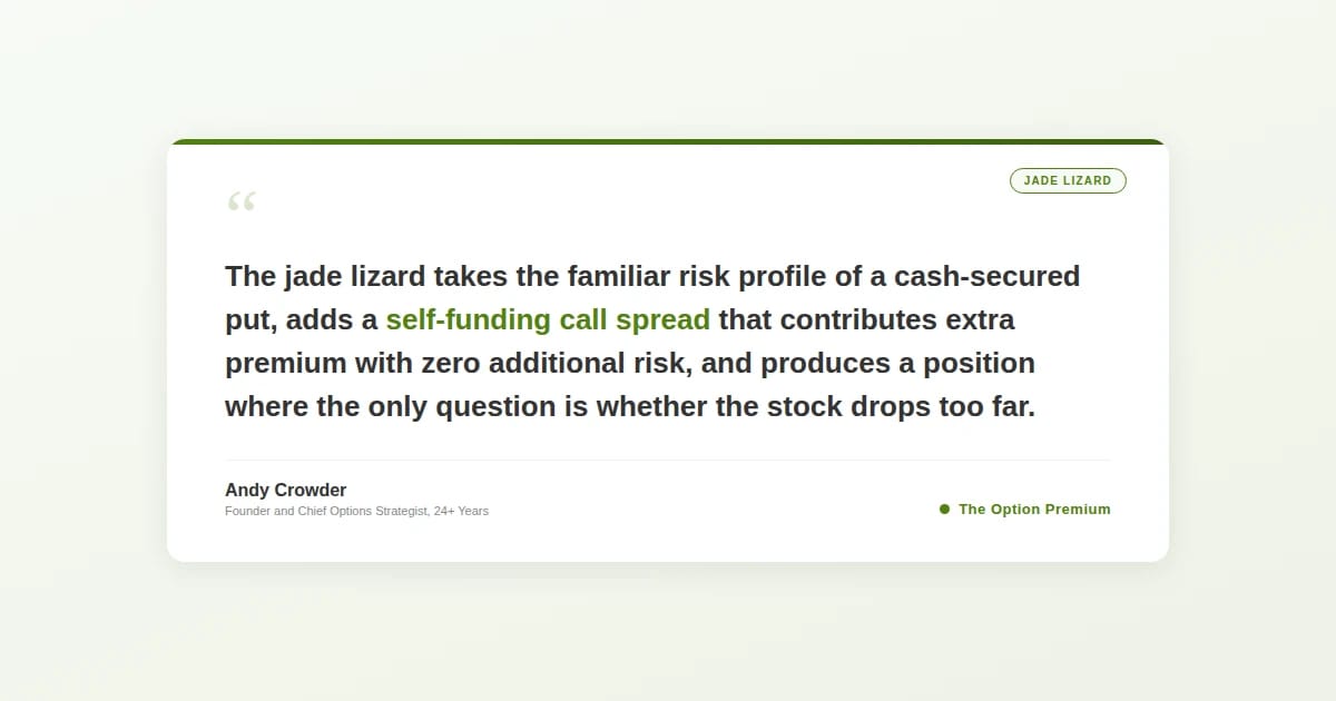 The jade lizard is the right structure when you want more premium than a cash-secured put, less risk than a strangle, and you're comfortable with naked put exposure on a stock you'd be willing to own.