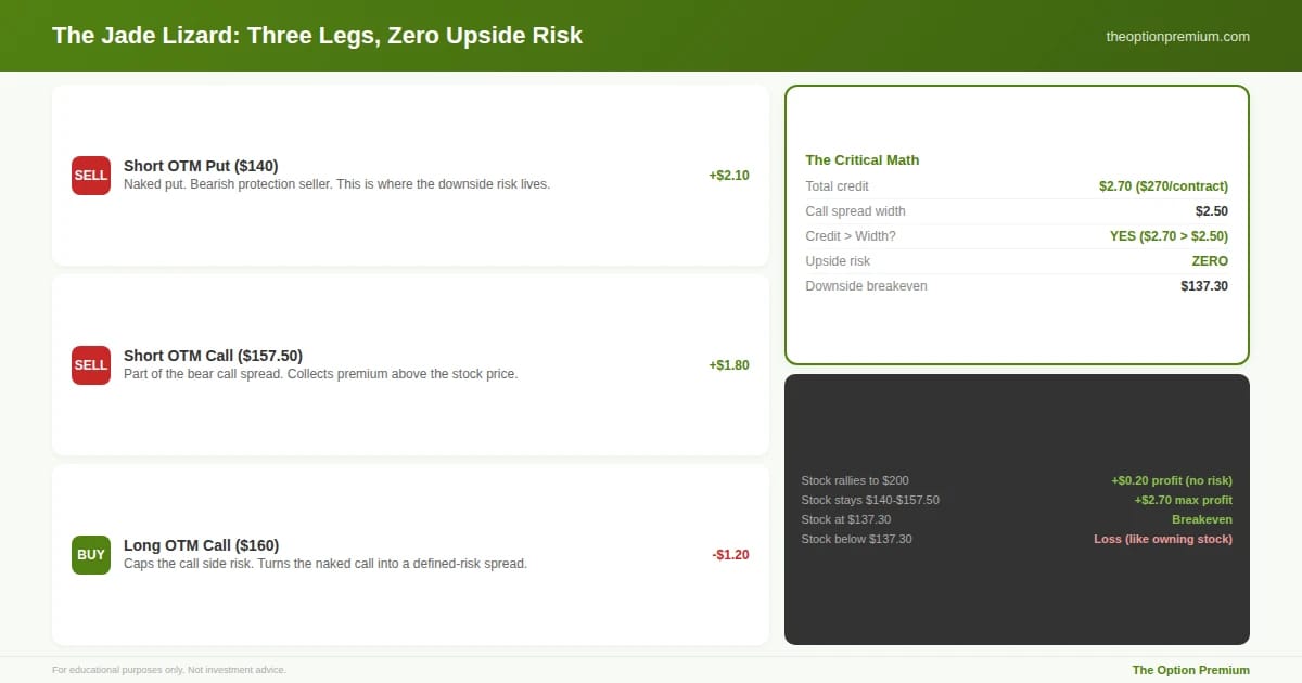 The jade lizard's three legs and the critical math that makes it work. Sell an OTM put (the downside risk leg, collects $2.10). Sell an OTM call (part of the bear call spread, collects $1.80). Buy a further OTM call (caps the call side, costs $1.20). Total credit: $2.70. Call spread width: $2.50. Because $2.70 exceeds $2.50, there is zero upside risk. If the stock rallies to any price, you net at least $0.20 profit. All risk is on the downside, with a breakeven at $137.30. Between the strikes ($140-$157.50), you keep the full $2.70.