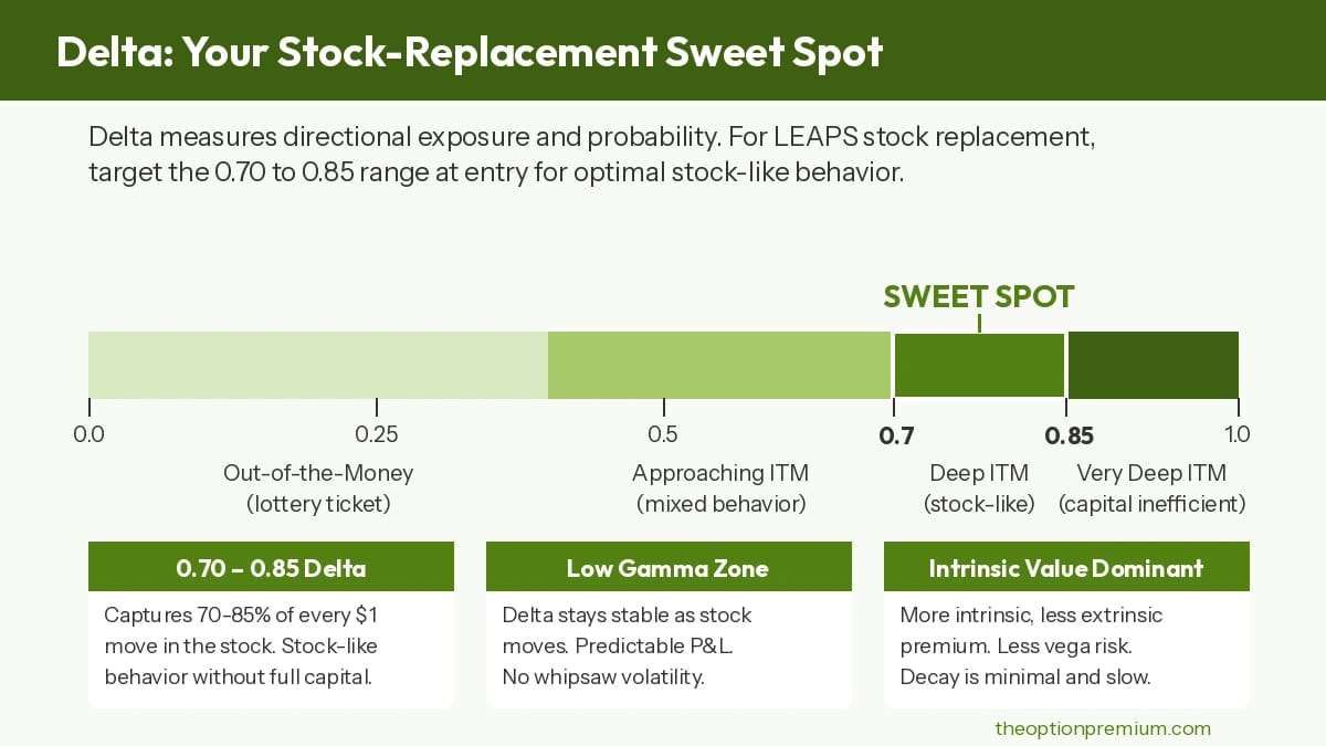 Not all LEAPS are created equal for stock replacement purposes. The sweet spot involves deep in-the-money calls with specific characteristics that maximize stock-like behavior while preserving capital efficiency.