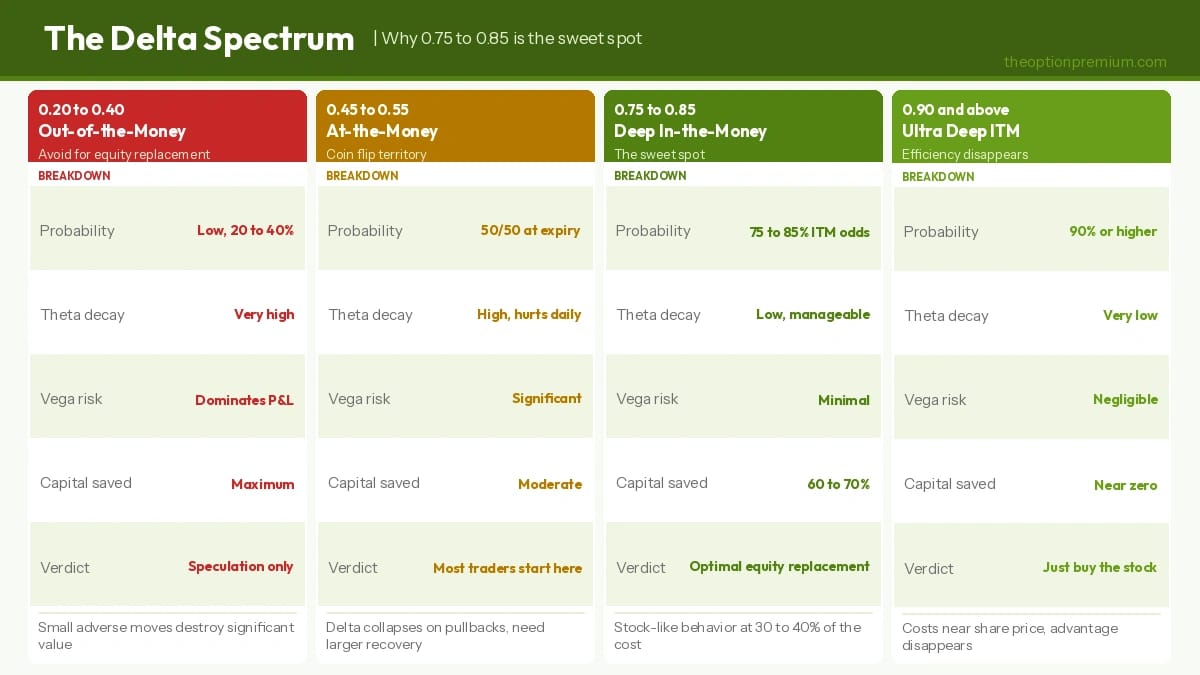 Deep-ITM options with 0.75 to 0.85 delta occupy the goldilocks zone to high enough probability to behave like stock, low enough premium to maintain meaningful leverage.