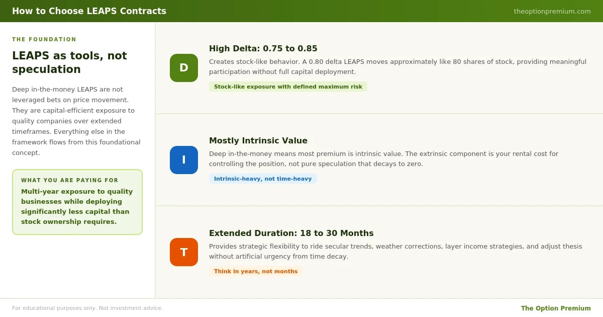 Before we dive into specifics, understand what deep in-the-money LEAPS actually represent. They're not leveraged bets on price movement, they're capital-efficient exposure to quality companies over extended timeframes.