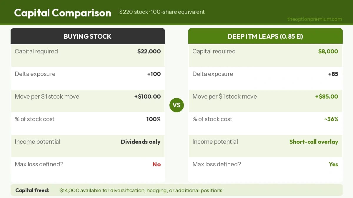 The stock costs $22,000. The deep ITM LEAPS costs $8,000. Both give you exposure to the same 100-share move. Only one of them also gives you $14,000 back to deploy elsewhere.