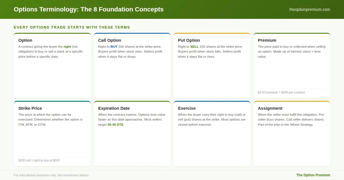 The 8 foundation concepts every options trader starts with: Option, Call, Put, Premium, Strike Price, Expiration Date, Exercise, and Assignment. Each defined in plain English with practical context.