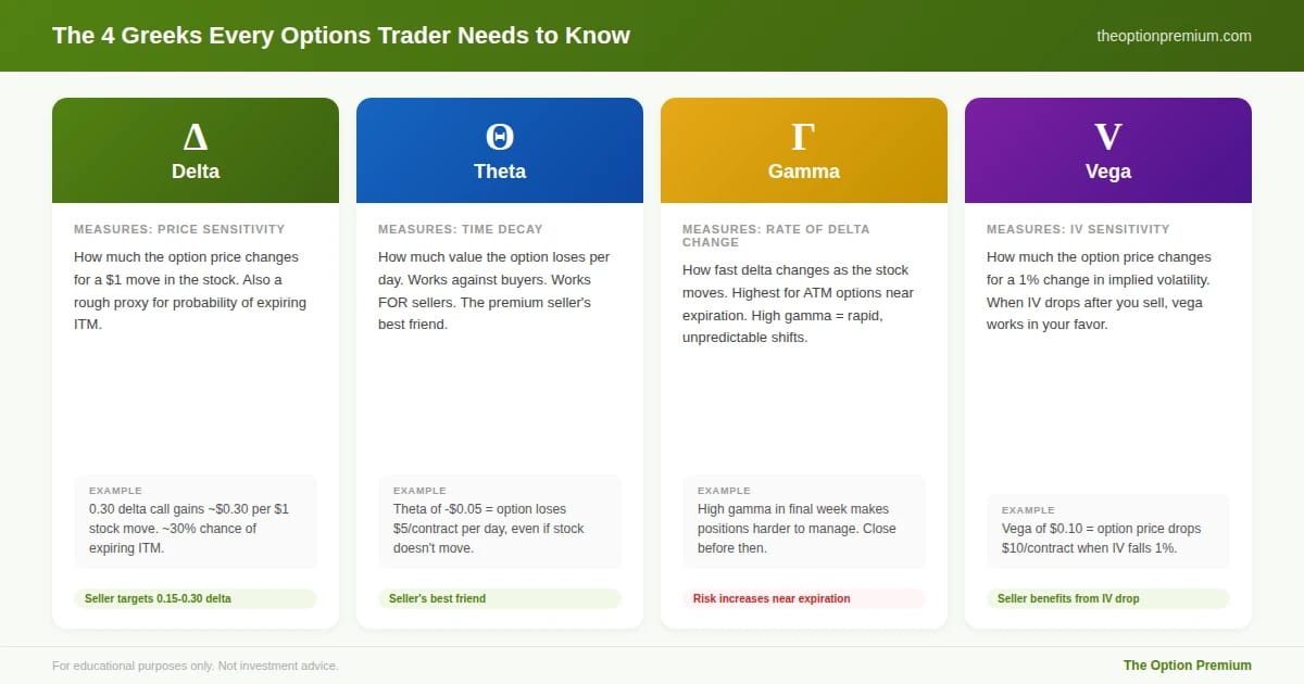 The Greeks (delta, theta, gamma, vega) measure how your option responds to changes in price, time, and volatility. Theta and delta are the two most important for premium sellers.