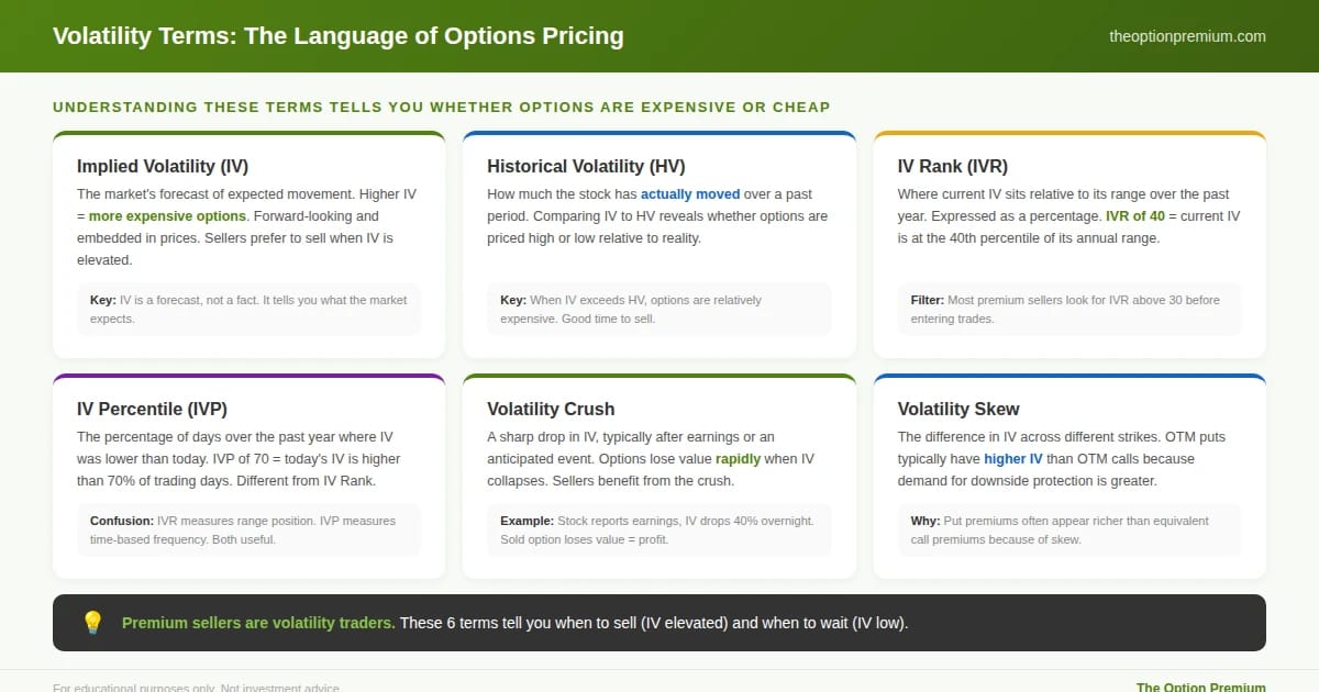 Volatility terms (IV, IVR, IVP, volatility crush) tell you whether options are expensive or cheap relative to historical norms. Premium sellers want to sell when IV is elevated.