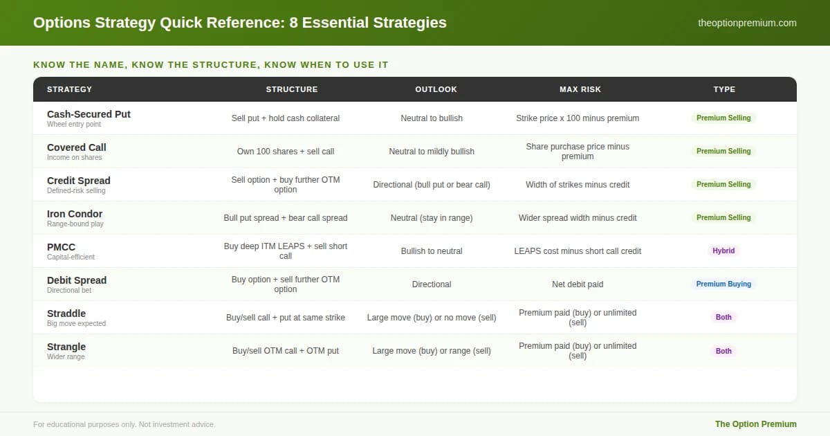 Quick reference for 8 essential options strategies: Cash-Secured Put, Covered Call, Credit Spread, Iron Condor, PMCC, Debit Spread, Straddle, and Strangle. Each with structure, outlook, max risk, and strategy type.