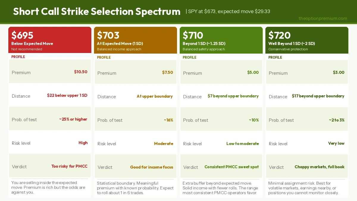 Short call strike spectrum for SPY at $673: $695 too risky, $703 at 1 SD, $710 PMCC sweet spot, $720 conservative with probability at each level.