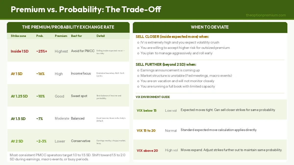 Most consistent PMCC operators I know aim for strikes at or slightly beyond the one standard deviation mark. You're collecting meaningful premium while staying on the right side of probability.