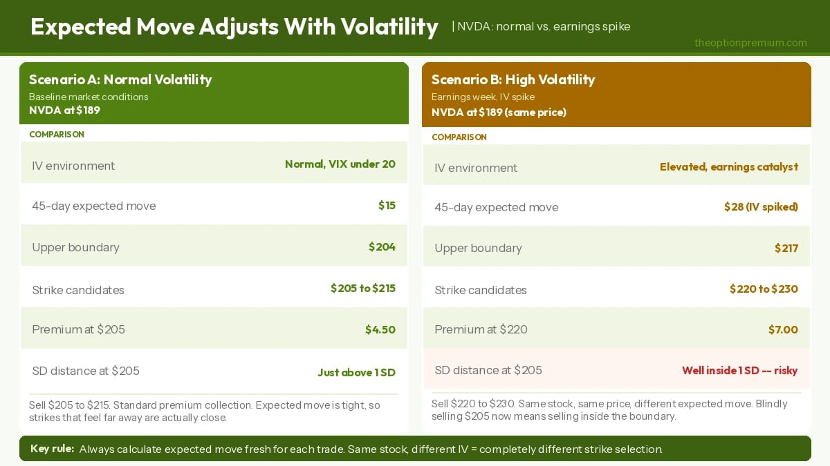 Always calculate expected move fresh for each trade. Don't assume "I usually sell 2 strikes out" will work in all volatility regimes.