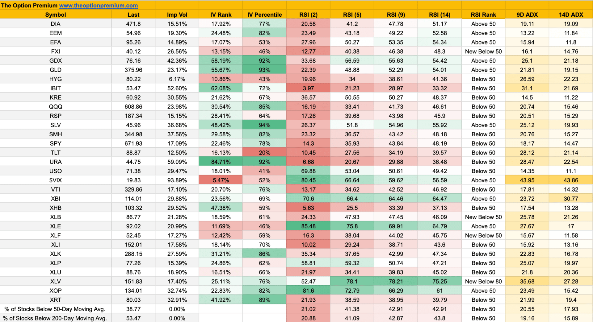 Volatility Metrics - IV Rank, IV %, RSI (2), (5), (9),(14), ADX (9), (14)