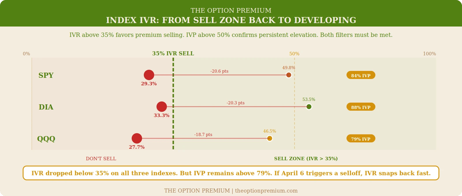 However, all three still have IVP above 79% (SPY 84%, DIA 88%, QQQ 79%). The persistent elevation in IVP tells you the market has been volatile enough, for long enough, that the baseline hasn't normalized. If the April 6 deadline triggers another selloff, IVR will snap back above 35% quickly. Be ready, but don't force it.