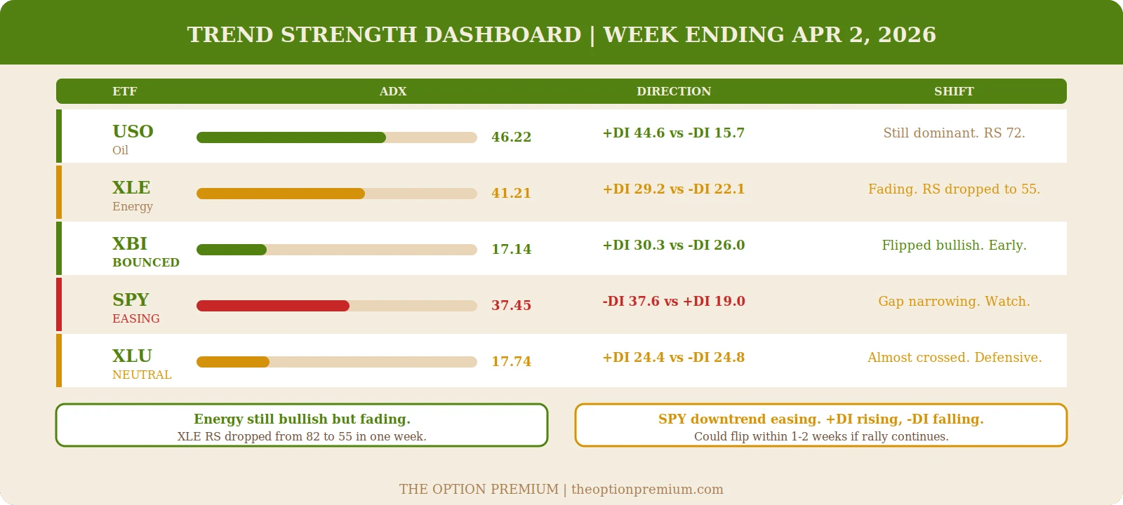 The energy dominance faded this week. XLE's relative strength dropped from Above 80 to Above 50. ADX at 41.21 with +DI at 29.19 vs -DI at 22.08. Still bullish, but the conviction weakened as oil pulled back mid-week. USO held stronger with RS at New Above 70 and ADX at 46.22.