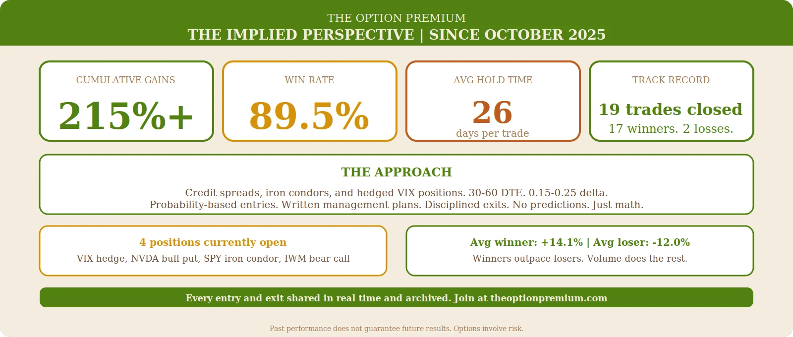 Since October, the Implied Perspective has closed 19 trades: 17 winners, 2 losses. 89.5% win rate. 26 days average hold time. Average winner: +14.1%. Average loser: -12.0%. Cumulative gains over 207%. Four positions currently open: a VIX hedge (long call), an NVDA bull put spread, an SPY iron condor, and an IWM bear call spread. Every entry and exit shared in real time and archived.