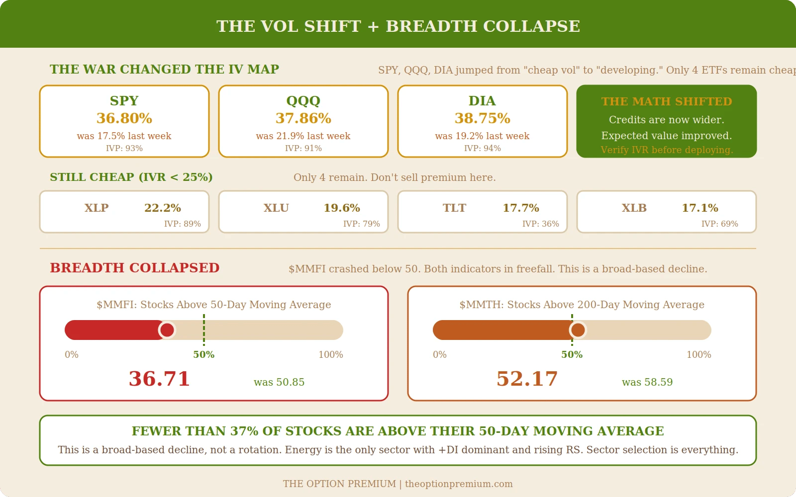 When volatility spikes, credits get richer. When fear rises, the gap between implied and realized volatility widens. When breadth deteriorates, sector selection separates the disciplined from the hopeful. Every tool in our framework, the IV Rank maps, the trend filters, the position sizing rules, exists for weeks exactly like this one.