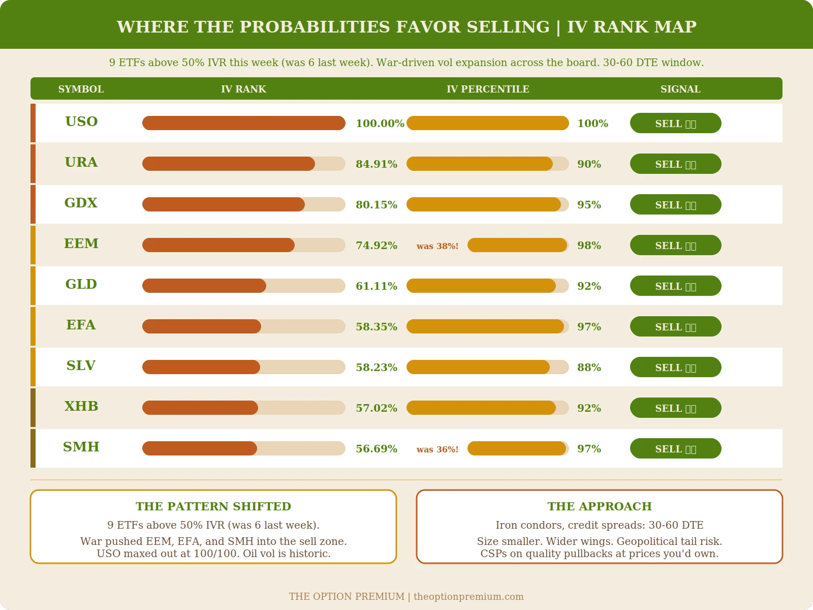 The sell zone expanded from 6 ETFs to 9 this week. War-driven volatility pushed EEM (74.92%, up from 38%), SMH (56.69%, up from 36%), and EFA (58.35%) into the rich-premium tier. USO maxed out at 100% IVR and 100% IVP, the first time we've seen a perfect score on both metrics. URA (84.91%), GDX (80.15%), GLD (61.11%), SLV (58.23%), and XHB (57.02%) round out the table, all with IV Percentile above 88% confirming this isn't a one-day spike.