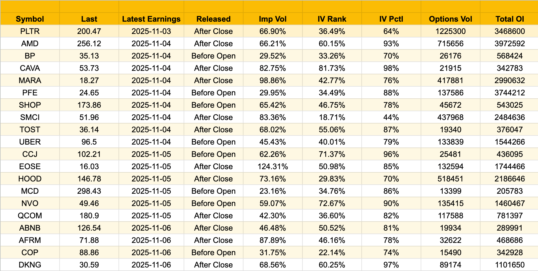 Quick standouts by data: AMD (IVR 60%, IV percentile 93%, ~4.0M OI) is the headliner for clean fills + meaningful premium; PLTR (IV 66.9%, ~3.47M OI) kicks things off Monday. QCOM (Wed PM) offers balanced IV (42%) with solid liquidity, while CCJ (Wed AM, IVR 71%, IV percentile 96%) and NVO (IVR 73%, IV percentile 90%) carry elevated ranks without extreme spreads.