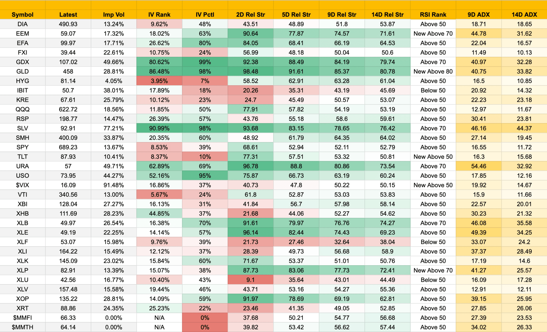 GLD, SLV, and GDX are screaming: elevated IV Rank, elevated RSI, and strong ADX. Translation: youāre getting paid, because the market expects movement. Thatās great for premium sellers, but it punishes tight strikes.