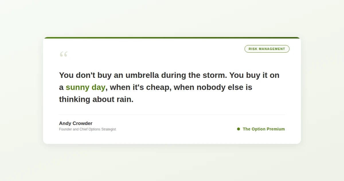You don't buy an umbrella during the storm. You buy it on a sunny day, when it's cheap, when nobody else is thinking about rain, and when you can choose exactly the one you want. The same principle applies to your portfolio.