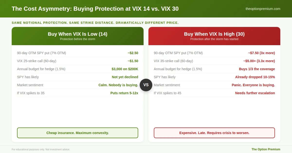 The cost asymmetry is not incremental. It's exponential. A 90-day OTM SPY put costs roughly $2.50 when VIX is at 14, but $7.50 when VIX is at 30. That's 3x more for the same notional protection, and the underlying has likely already fallen 10-15% by the time VIX reaches 30. When you buy cheap, every dollar of hedging budget buys maximum coverage with maximum convexity. When you buy during a panic, you're paying peak prices for protection that requires the crisis to worsen further just to break even.
