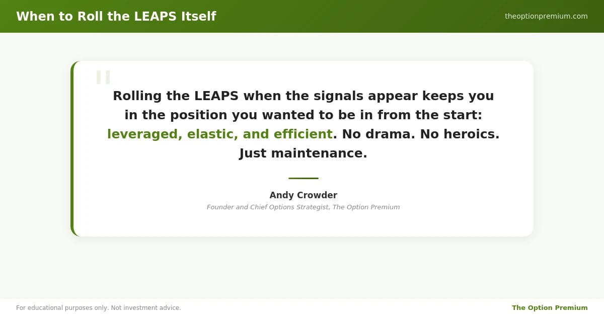 Rolling the LEAPS itself isn't about ego or chasing bigger gains. It's about maintaining the mechanical advantage that made you buy a LEAPS in the first place: controlled exposure with defined risk and elastic upside. When that advantage erodes, you reset it.